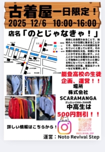 2025年12月6日(土)、能登町宇出津にて、1・2年生有志7名による1日限定の古着屋「のとじゃなきゃ!」が開催されました。